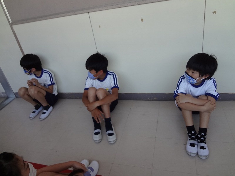 保健室に入る人数を制限し、本来なら子どもたちに自分で名前を言ってもらうところを、胸に付けた名札で確認することに変更。通常より時間はかかりますが、子どもたちは静かに順番を待っています。