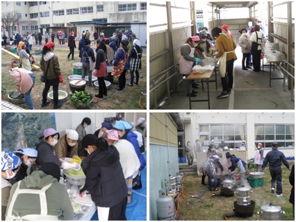 早朝から楽寿会のみなさんやPTAのみなさんに集まっていただきました。かまどからは湯気が立ち上り、小松菜が茹でられています。もち米も蒸し上がりました。いよいよ餅つきが始まります。