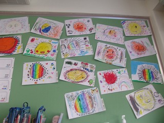 1年生の教室には太陽の作品がかざられています。1年生のみなさんが自慢するほどの自信作だそうです。みんなの太陽のおかげで教室がとても明るくなっていますね。これからも作品作りをがんばっていきましょう。