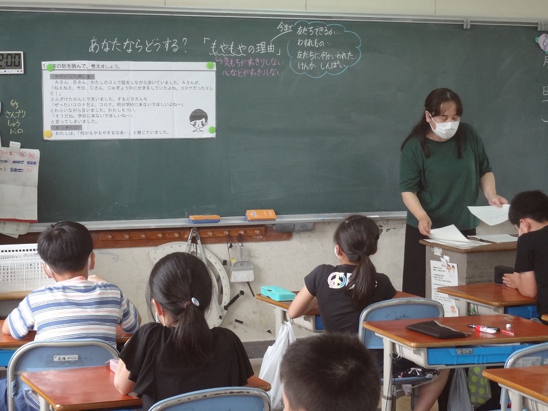 1年生では、「せきをしたともだち」、4年生では「あなたならどうする?」という学習をしました。せきをしただけだから、コロナウイルスに感染していると決めつけずに、相手の気持ちや体調を気遣うと答える子どもたちでした。きっとこれからも差別的な言動に同調することなく、正しい判断をしてくれるものと期待しています。