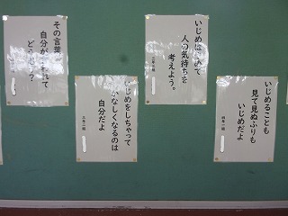 児童玄関に全校で取り組んだ「いじめの標語」が掲示してありました。クラスごとにしっかりと考えてあり、とてもいい標語だと思います。17文字にまとめるのが難しいと言っていた人もいました。この標語どおりに、これからもいじめのない下野小学校にしていきたいです。