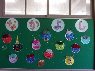 今日もなかよし前の掲示板を紹介します。今、なかよし前の掲示板には、鬼の顔が飾ってあります。紙皿に鬼の目を切り抜くのが難しかったです。角を作るのも難しかったです。また、紙皿に折り紙も貼ってあります。折り紙を隙間なく敷き詰めるのが大変でした。またぜひ見に来てください。