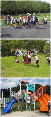 秋晴れの空の下、1・6年、2・4年、3・5年のペア学年で遠足に行ってきました。伊坂ダム、北勢中央公園、羽津山緑地どの目的地も他校と重なることなく貸し切り状態。思い切り飛んだり、すべったり、子ども達は存分に秋の一日を満喫したようでした。