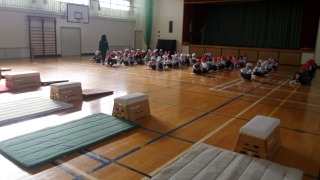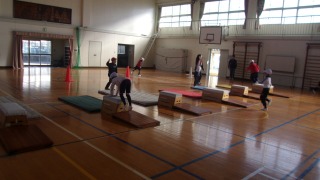 3学期の「とびばこあそび」の学習が始まりました。まず、安全に準備することから始めます。短時間で、協力しながら準備ができるようになりました。ふみこしとび、またぎこしとび、またぎのり、またぎおりと、いろいろなとび方でとぶ学習をしました。「とびばこ楽しい。」「できるようになったよ。」と、子どもたちの声が聞こえてきました。