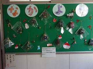 最近、なかよしの廊下の掲示物が変わっていました。12月ということで、松ぼっくりで作ったクリスマスツリーが掲示してありました。その松ぼっくりは、先生が多度山の山頂から人数分拾ってきたそうです。作った子は「楽しかった」と言っていました。私たちも作ってみたいと思いました。