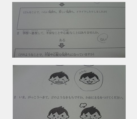先週、分散登校の際、子どもたちに簡単なアンケートを実施しました。「学校が休みの間に、つらい気持ちや苦しい気持ち、イライラしたりしたことはありませんか。」「学校へ登校して、不安なことや心配なことはありませんか。」などの設問に答えてもらいました。(写真参照)