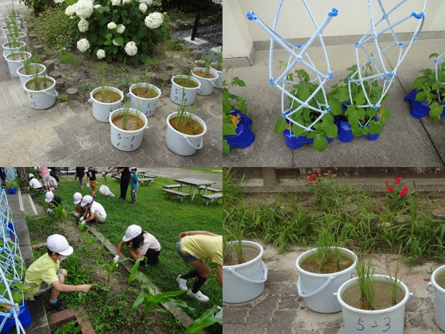先日5年生が植えたバケツ稲。少しずつ丈が伸びてきました。学校再開後に1年生が植えたアサガオ。毎日お世話と観察を続けています。どの鉢も大きく弦を伸ばしています。2年生の畑では、学校休業中に先生が植えた野菜たちが元気に育っています。今日は涼しいので、2年生の子どもたちが畑の草抜きをしました。
