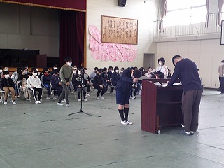体育館で卒業式練習をしています。マイクを使っての一人一言のせりふと、そのあとに卒業証書を受け取る練習をしました。18日のために、残り少ない練習時間を大事にしたいと思います。
