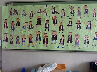 4年生の教室の横のロビーに、運動会で4年生が踊ったソーランの絵が飾ってありました。一人一人が踊っている自分の絵を描いていました。また見てみてください。