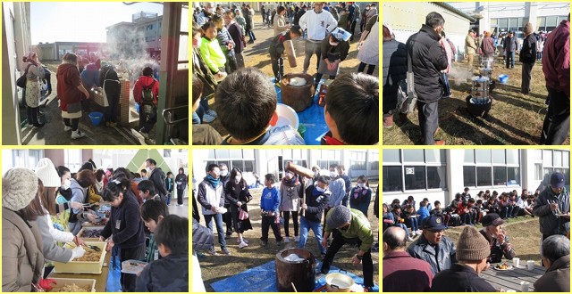 13日(土)、朝はすごく冷え込みましたが、気持ちのいい青空の穏やかなお天気に恵まれました。朝早くから、PTAの役員・楽寿会・地域の方々が集まってくださり、今年も無事に餅つき大会を行うことができました。子どもたちは、4種類のつきたてのお餅をいただくのをとても楽しみにしていました。4年生以上は、餅つき体験もさせていただきました。みんなでうすを囲み、「1,2,3・・・」と数を数えたり、つき方を教わったり、なごやかな時間となりました。PTAの役員の皆さんには前日準備もお世話になりました。本当にありがとうございました。