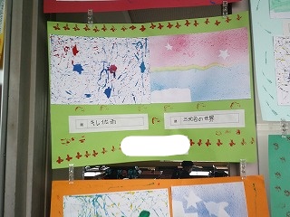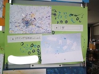 ビー玉をころがしたり、形を置いて吹きつけたりして、いろいろな模様ができています。
