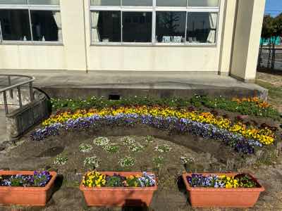 毎日、栽培委員の子たちが、水やりや草取り、花殻つみをしてくれています。おかげで、花壇には、元気できれいな花たちが次々に咲いてくれて、とてもきれいです。チューリップの芽も出始めました。だから、絶対に踏まないでほしいです。