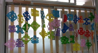 1年生が図工でちょきちょきかざりを作りました。ちょきちょきかざりは、はさみを使って折り紙を折って、好きな形に切りました。切った折り紙を広げた感想は「こんな形になるんだ」「どんな順番にかざろうかな」などの声が聞かれました。