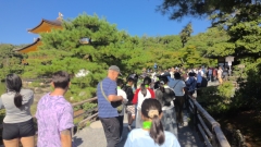 二番目の見学地、金閣寺に着きました。たくさんの見学客がいます。班ごとに写真を撮ってから見学をしました。