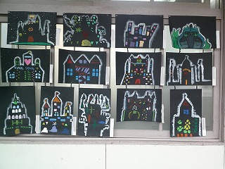 今、5年生の教室の前に5年生の図工の作品である「自分らしいおしろ」が掲示してあります。図工で自分が描きたいおしろを描いて、切り貼りをしました。みんな、自分なりのおしろが出来上がりました。