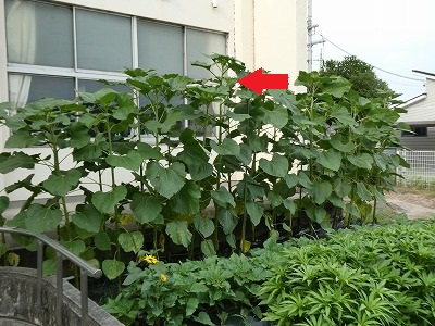 図工室前のひまわりが、2mを越えました。茎もずいぶん太くしっかりしています。また、つぼみは見えませんが、どのくらい大きくてきれいな花を咲かせてくれるのか、とっても楽しみです。栽培委員会の子たちが水やりをしてくれています。ありがとう。大きなひまわりが、みんなを見守ってくれています。