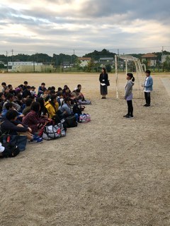 今日と明日の2日間、神戸京都への修学旅行に行ってきます。運動場で出発式をした後、2台のバスで出発です。