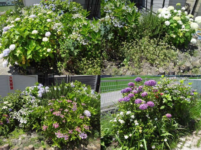 登校指導をする際、毎朝、昇降口の花壇を観察していますが、アジサイが色づいてきました。これから一番きれいな時期を迎えますので、来校の際にはお立ち寄りください。