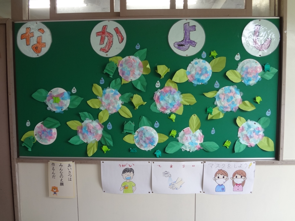 また、掲示板にも子どもたちの作ったアジサイの花が咲いています。