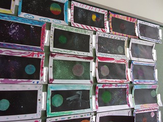 4年生「マイコスモファンタジー」という作品が、4年生の掲示板に貼られていました。宇宙を表現した作品です。スパッタリングという技法を使い、色んな世界が出来上がりました。