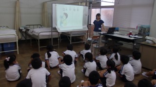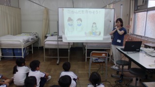 ○早く寝るようにしよう。○朝ご飯をしっかり食べよう。外では、帽子をかぶろう。○活動後だけではなく、活動前にも水分を取ろう。○体を冷やす工夫をしよう。と、画像を使って、詳しく教えていただきました。