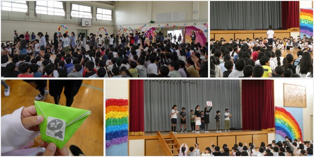 全校が体育館で、6年生と手をつないだ1年生をむかえました。みんなで校歌をうたったり、2年生からアサガオの種のプレゼントをもらったりしました。下野小〇✕クイズでは、みんなで盛り上がっていました。1年生の皆さんも、これから、もっともっと下野小学校の生活に慣れて、元気に過ごしてください。
