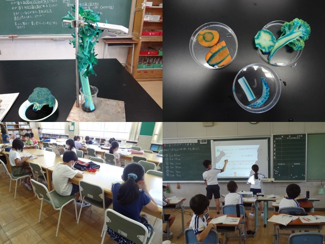 理科では、ニンジン、ブロッコリー、セロリを染色液につけた演示実験の観察をしていました。