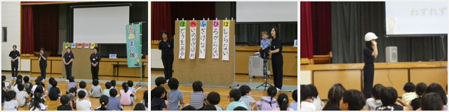 低学年では、交通ルールを守って安全に歩行することを中心に、ケンちゃんによる「はひふへほ」で教えていただいたり、通学路で気を付けること、ヘルメットの正しいかぶり方について教えていただきました。