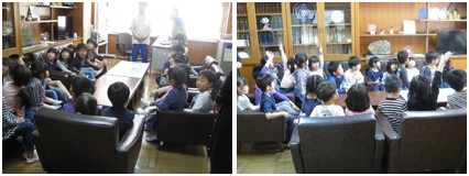 生活科の『がっこうたんけん』で、1年生が校長室に来てくれました。クラスごとに全員がソファに腰かけて、校長室にあるいろいろなものをみては、「あの地図は何ですか?」(下野校区を示した地図です)「あそこに並んでいる写真は誰ですか?」(歴代の校長先生です)「金庫には何が入っていますか?」(大切な書類が入っています。お金は入っていません)と質問をしてくれました。最後にはちゃんと「しつれいしました。」とあいさつをして、次のたんけんに向かいました。