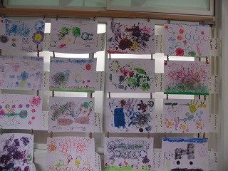 1年生の教室の前にペタペタコロコロの作品が掲示してあります。コップやしんの丸を使い、花を作っている子や手を使っている子もいました。