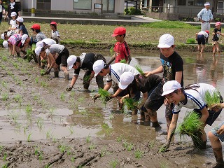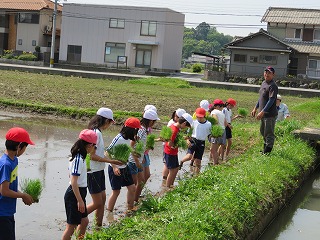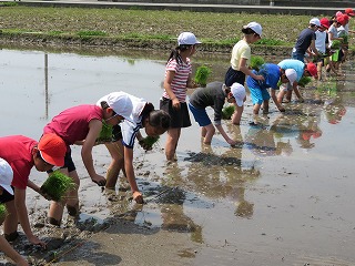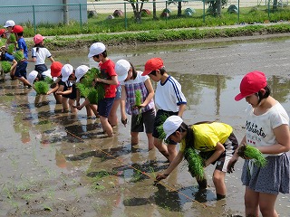 地域の方々に協力していただき、上手に田植えを行うことができました。