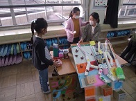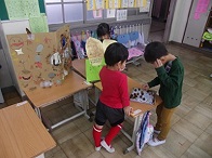 今日は秋のおもちゃ屋さん本番でした。子どもたちは、「みんなに楽しんでもらいたい。」「どんなおもちゃ屋さんがあるか楽しみ。」ととてもわくわくしていました。魚釣りやコリントゲーム、けん玉や輪投げなどいろいろなおもちゃ屋さんがあり、とても楽しんで活動していました。