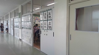 現在4年生の教室前で、習字の作品「土地」が展示されています。