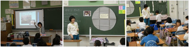 いつもおいしくいただいている給食がどのようにつくられるのか、スライドで教えてもらいました。子どもたちは、調理員さんたちが8人で560人分の給食を作ってくれていることにとても驚いていました。給食の調理に使うお釜の大きさの紹介や、おかずをかきまぜる本物の道具を触らせていただくことで、より大変さが実感できたようです。最後に、調理員さんたちからの手紙を紹介していただき、毎日のおいしい給食を作ってくれて「ありがとう」と感謝の気持ちを持つことができました。1年生の教室は、給食室のすぐそばなので、休み時間にはその様子をのぞいていました。