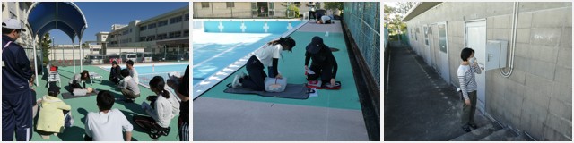 6月13日から始まるプールでの水泳学習に備えて、職員の救命法講習会を行いました。講師は、養護教諭の藤井先生でした。今年度は、実際の場を想定し、プールサイドで講習を行いました。2人1組になって、心臓マッサージや人工呼吸、また、内線での連絡やAEDの使い方など、具体的にしっかりと練習をしました。