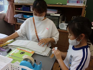 休み時間に1年生のところに行ってみると、先生に計算カードを聞いてもらっている姿がありました。1枚1枚めくって答えを言っていました。計算が早くなって、たくさん問題が解けるといいですね。