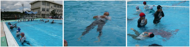 着衣水泳とは、洋服を着ている状態で、もし、海や川などの中に落ちてしまったら、どのようにして自分の命を守ればいいのかを体験しながら学ぶものです。服を着て水に入ると、重く動きづらいこと、また、背浮きをして助けを待つこと、ペットボトルを使って浮く体験など、脇先生に教えていただきました。