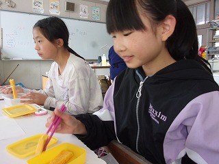 11日(木)に、6年2組では卵を使った調理実習をしました。卵焼きは難しいので、先生のお手本をしっかりと見ました。たくさんの子が、きれいに巻けていたので、将来の自分の力になっていけばいいなと思います。