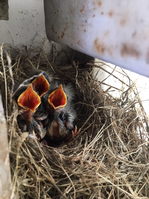 以前紹介した渡り廊下のハクセキレイの巣の卵から雛が産まれました。親鳥から餌をもらおうと元気な声で鳴いています。