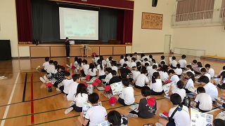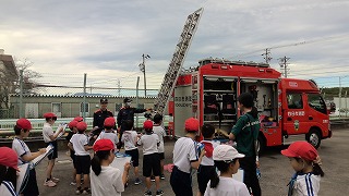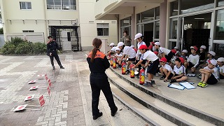 今日は、その学習とのつながりで、防火教室があり、四日市市北消防署北部分署の方々に来ていただきました。防火に関する講話だけでなく、天ぷら油火災実験、けむり体験、水消火器体験、消防車両見学など、様々な体験をさせていただきました。