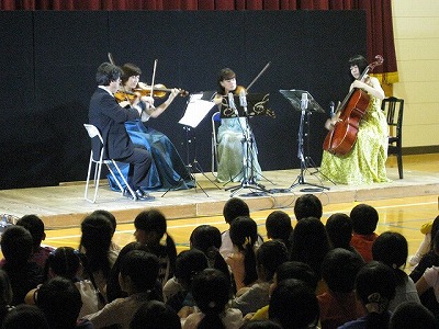昨年に引き続き、学び舎音楽会が開催されました。今年はア・ピアチェーレさんを迎え、弦楽四重奏を楽しみました。きれいな音色に聞き入っていた子ども達、「トトロ」や「下野小学校校歌」の演奏が始まると、誰からともなく歌い出して、体育館がきれいな歌声に包まれていました。素敵な演奏をありがとうございました。