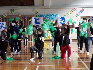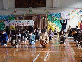 2月24日(水)、2限目から、6年生を送る会がありました。6年生を送る会ではまず、4年生の「6年生へ送る『全集中』」からはじまりました。今年流行したアニメの名言を歌に合わせて発表してくれました。