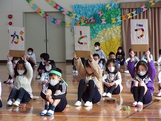 1年生は、「6年生におくるスイミー」の発表でした。発表の前に、1年生から折り紙で作った手作りのペンダントをもらいました。そのあとに、スイミーを歌や群読で発表してくれました。
