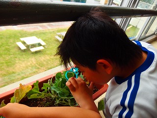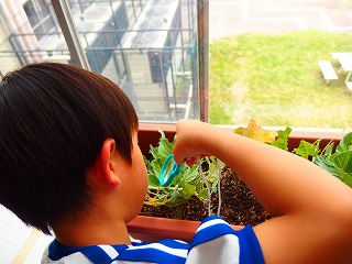5月から、モンシロチョウの幼虫を育てています。幼虫が元気に育つように日々お世話を頑張っています。幼虫の様子を集中して観察したり、「大きく育ってほしいな」と楽しそうに話したりする様子が見られます。さなぎになるのを楽しみにしています。
