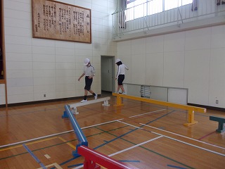 今、5年生の体育の時間には、跳び箱をしたり、バスケットボールをしたりしています。今日は、平均台をしていました。みんな楽しそうに取り組んでいました。