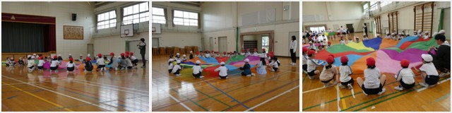 2年生は、運動会の表現の練習に取り組み始めました。パラバルーンを使った表現です。クラスで1つのパラバルーンを持ち、上下左右に揺らしたり、膨らませたりといろいろな動かし方に挑戦していました。先生の話をよく聞いて、初めてなのに、声をかけ合って動かす様子がありました。これから、どんな表現になっていくのか、とても楽しみです。