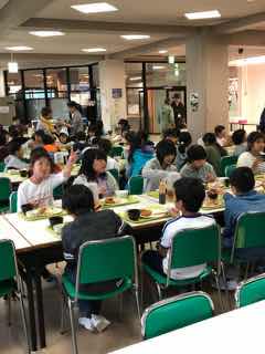 食堂で夕食をいただいています。しっかり活動したのでお腹もペコペコです。