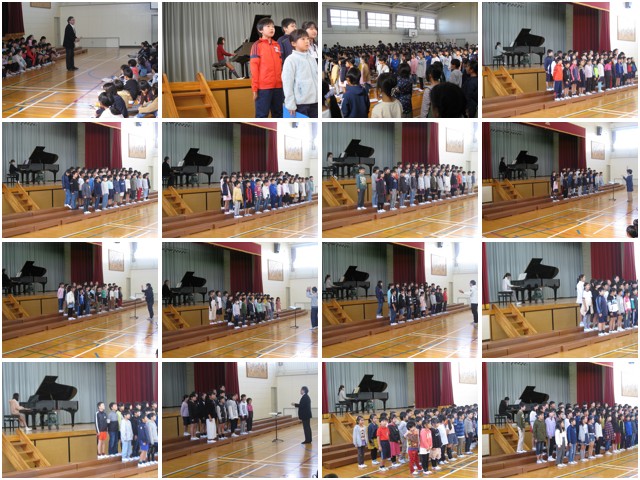 8日(金)の3・4時間目、音楽学習発表会を行いました。全校児童が体育館に集まり、クラス又は学年の合唱発表を聴き合うというものです。初めての試みでしたが、どの発表も聴き応えがあり、聴いている子ども達の姿勢も真剣そのものでした。改めて子ども達の歌声の持つパワーのすごさを感じることができ、嬉しくなりました。