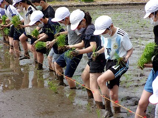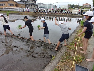 4月23日(金)に田んぼで5年生が田植え体験をしました。5年生のみんなは、普段できない体験をして「足が重くなった」「楽しかった」などの声が聞かれました。貴重な体験でした。とても楽しかったです。