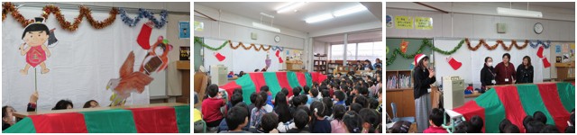 6日(木)の20分休みに低学年図書室で、毎年この時期恒例となっている、図書ボランティアさんによる『クリスマス会』がありました。事前に校内各所にポスターを貼って予告していただいたこともあって、会場は超満員。ペープサートによるオリジナルストーリーの劇で、大盛り上がりのひと時でした。図書ボランティアのみなさん、ありがとうございました。